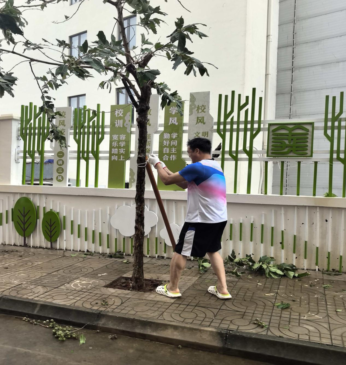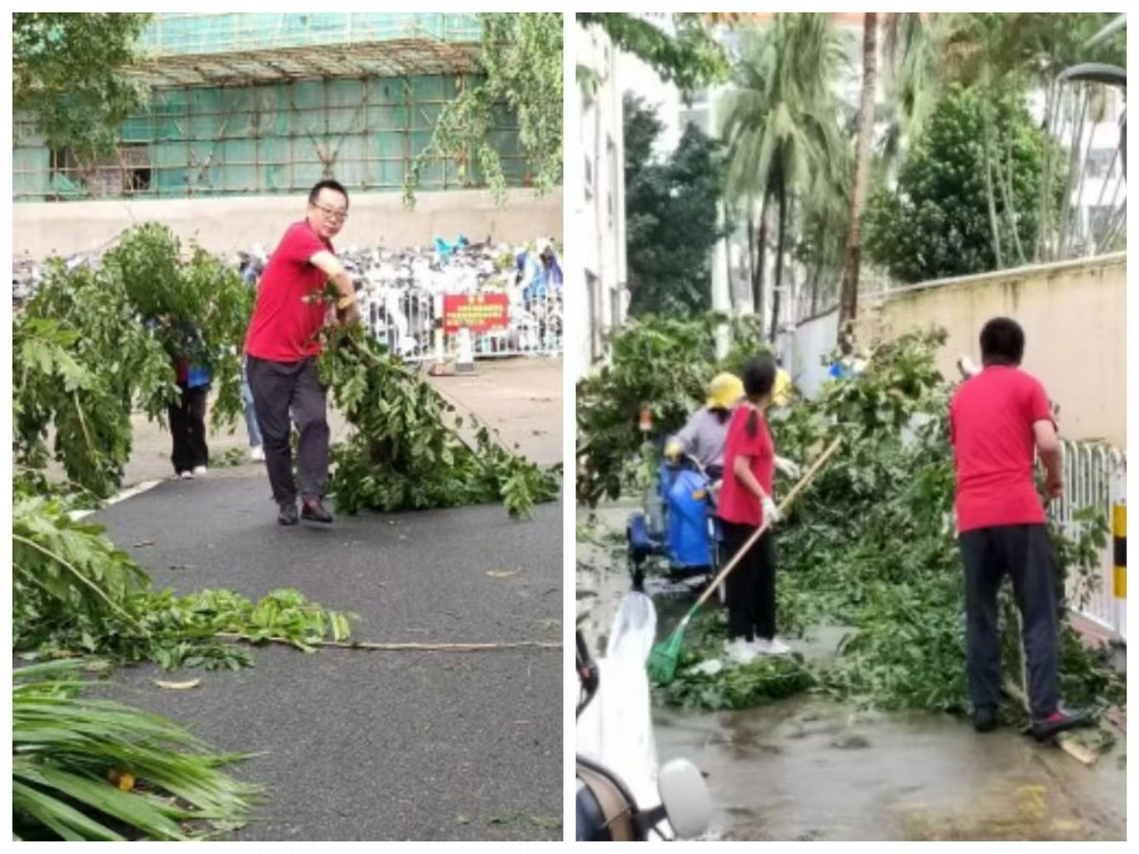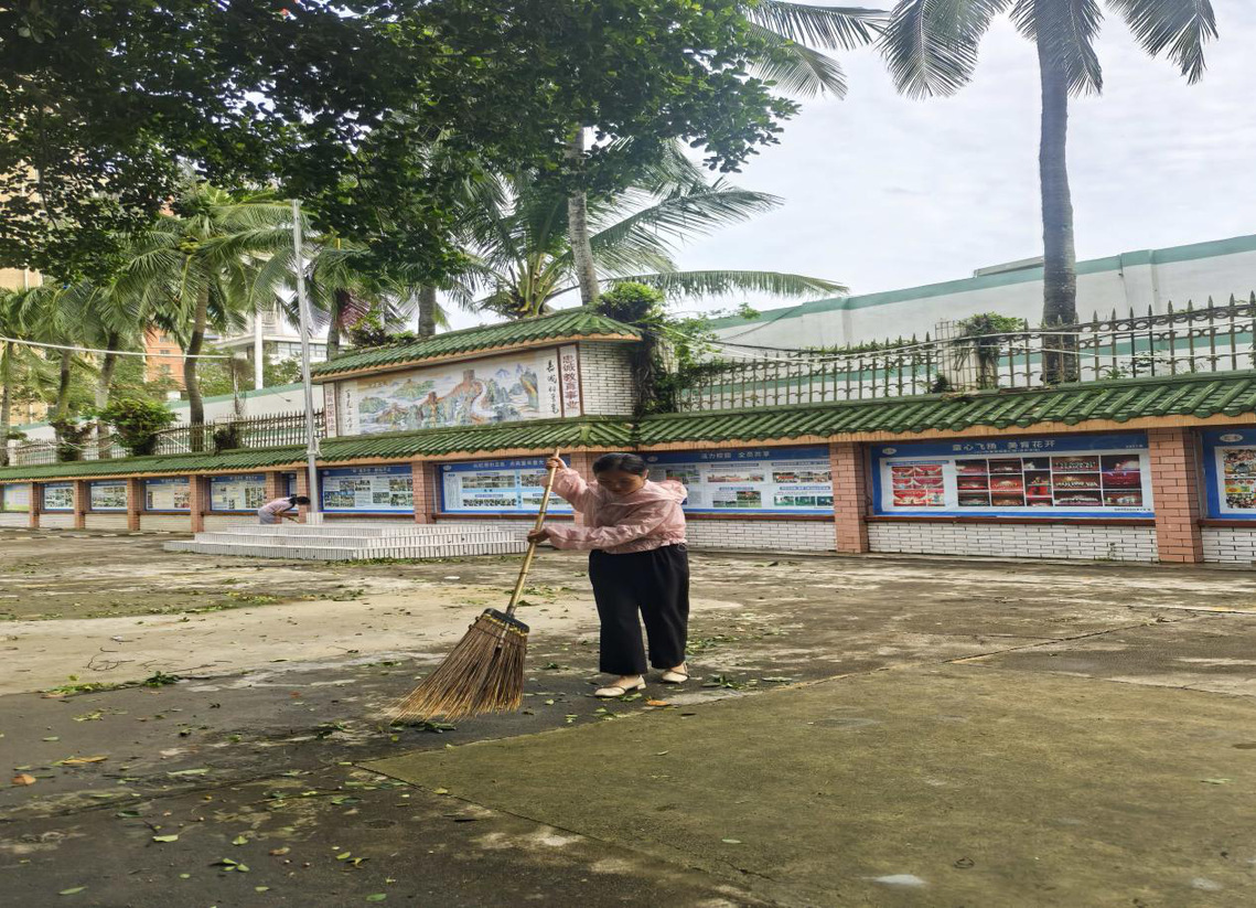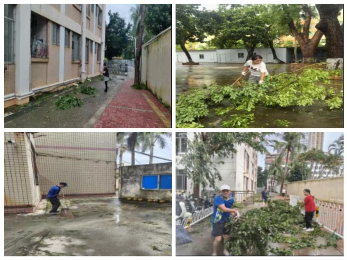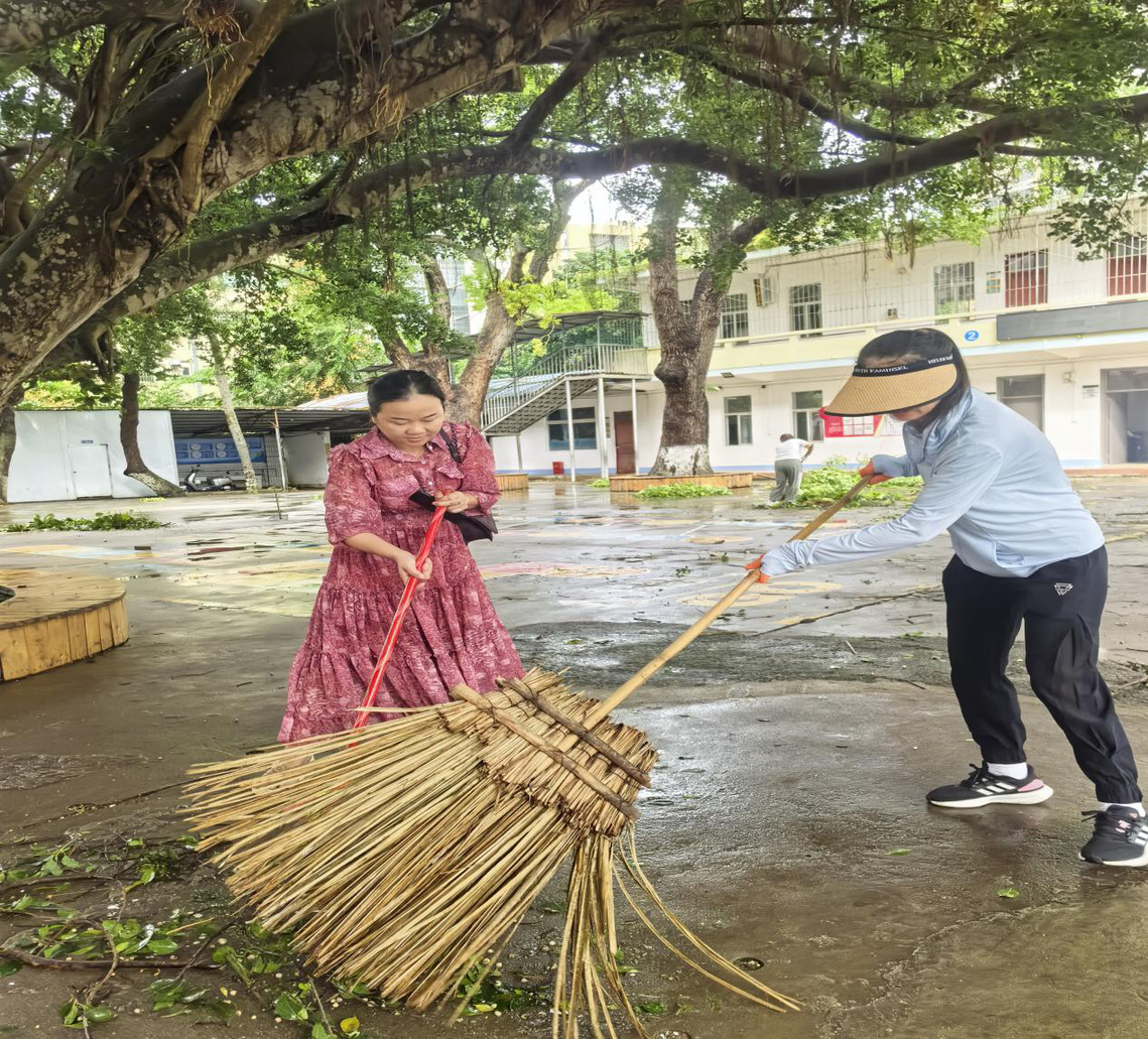 台风过后,校园内随处可见倒伏的树木枝叶、淤积的污泥和杂物,部分设施也受到不同程度的影响。按照海师大校长专题会议要求,附小党支部书记、校长梁胜娟带领巨乳做爱班子成员,积极组织在海口的教职工迅速返校,高效开展灾后清理修复工作。大家分工明确,默契配合:有的挥动扫帚清理落叶断枝,有的手持高压水枪冲洗地面淤泥,有的合力扶正加固被风吹倒的绿植,有的仔细检查电路、教学设备的安全状况……汗水湿透了衣背,但没有人叫苦叫累,心中只有一个共同的信念——尽快让校园恢复原貌,为孩子们提供一个干净、安全的学习环境。