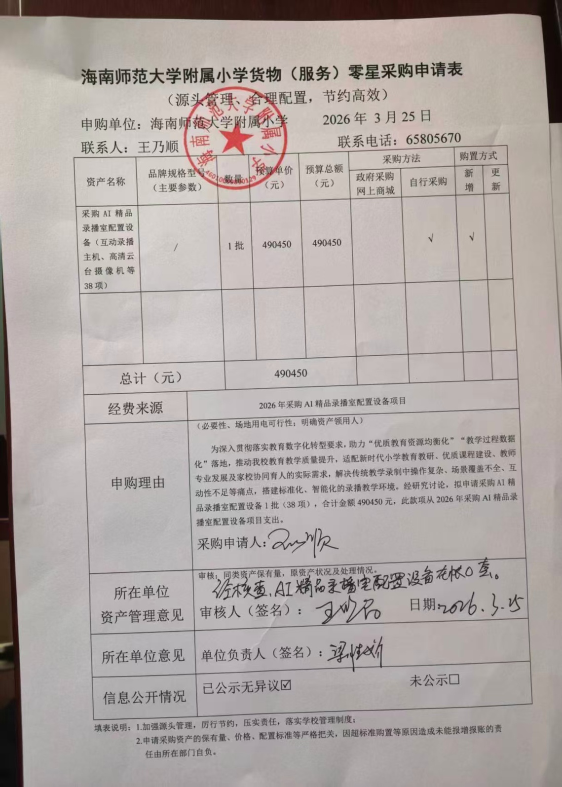 为深入贯彻落实教育数字化转型要求,助力"优质教育资源均衡化""教学过程数据化"落地,推动巨乳做爱 教育教学质量提升,适配新时代小学教育教研,优质课程建设,教师专业发展及家校协同育人的实际需求,解决传统教学录制中操作复杂,场景覆盖不全,互动性不足等痛点,搭建标准化,智能化的录播教学环境。经研究讨论,拟申请采购AI精品录播室配置设备1批(38项),合计金额490450元。